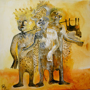 Fola offre a voir un travail saisissant évoquant les contes et légendes africaines, ce dernier expliquant: " à travers ce travail pictural, je cherche à faire le lien avec notre tradition orale et l'ensemble des valeurs culturelles du monde noir".