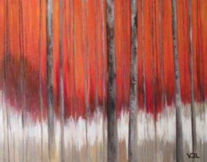 Attirée par l’abstraction, elle peint depuis plusieurs années des carrés qui symbolisent des idées rationnelles, avec une arrière pensée l’approche réglementée de notre société et de ses codes. Les arbres signifient l’évasion. Un ancrage profond dans le sol, avec racines et origines, et les troncs s’élèvent vers les airs, la spiritualité, vers le désir de contemplation de la vie en élévation, pour flotter un peu au-dessus du réel.